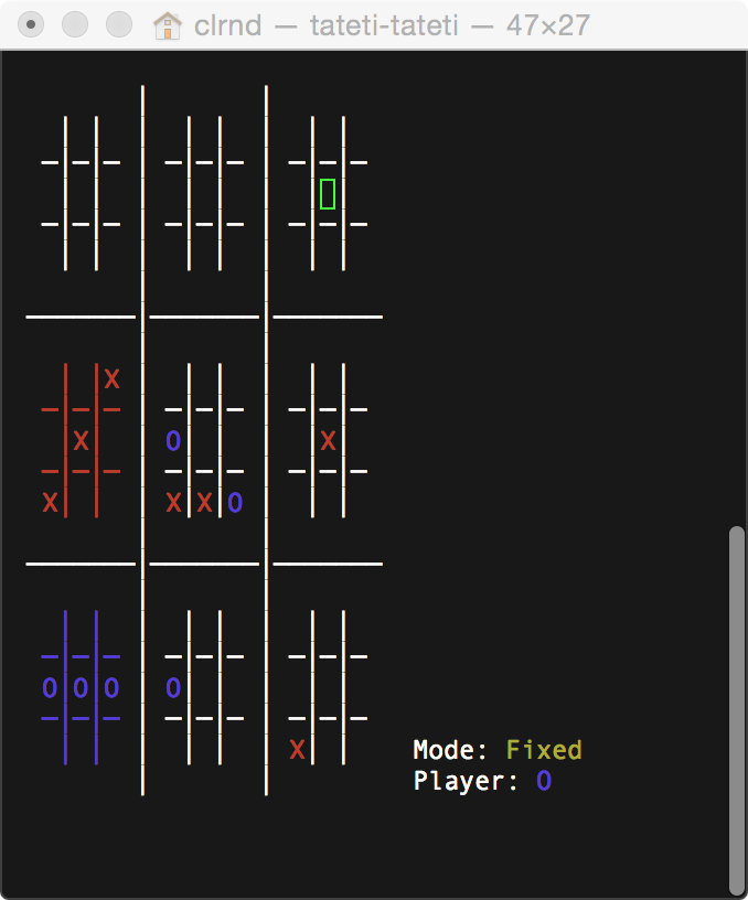 The game mode is a simple sum type data Mode = Free | Fixed. Free means the player can choose his/her next sub-board (for example in the first turn), where Fixed means they can’t (for example after a valid move from the other player).